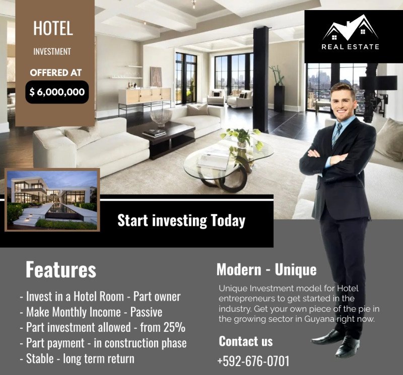 Please join us as we embark on this journey of building hotel in Guyana with local owners. These owners will enjoy a passive mothly income from the returns of the hotel. The invest amount is $6.0 per room fully furnish but up to four people can partatke in one room. Make money while you sleep because you are providing a service for other people to sleep when they travel.